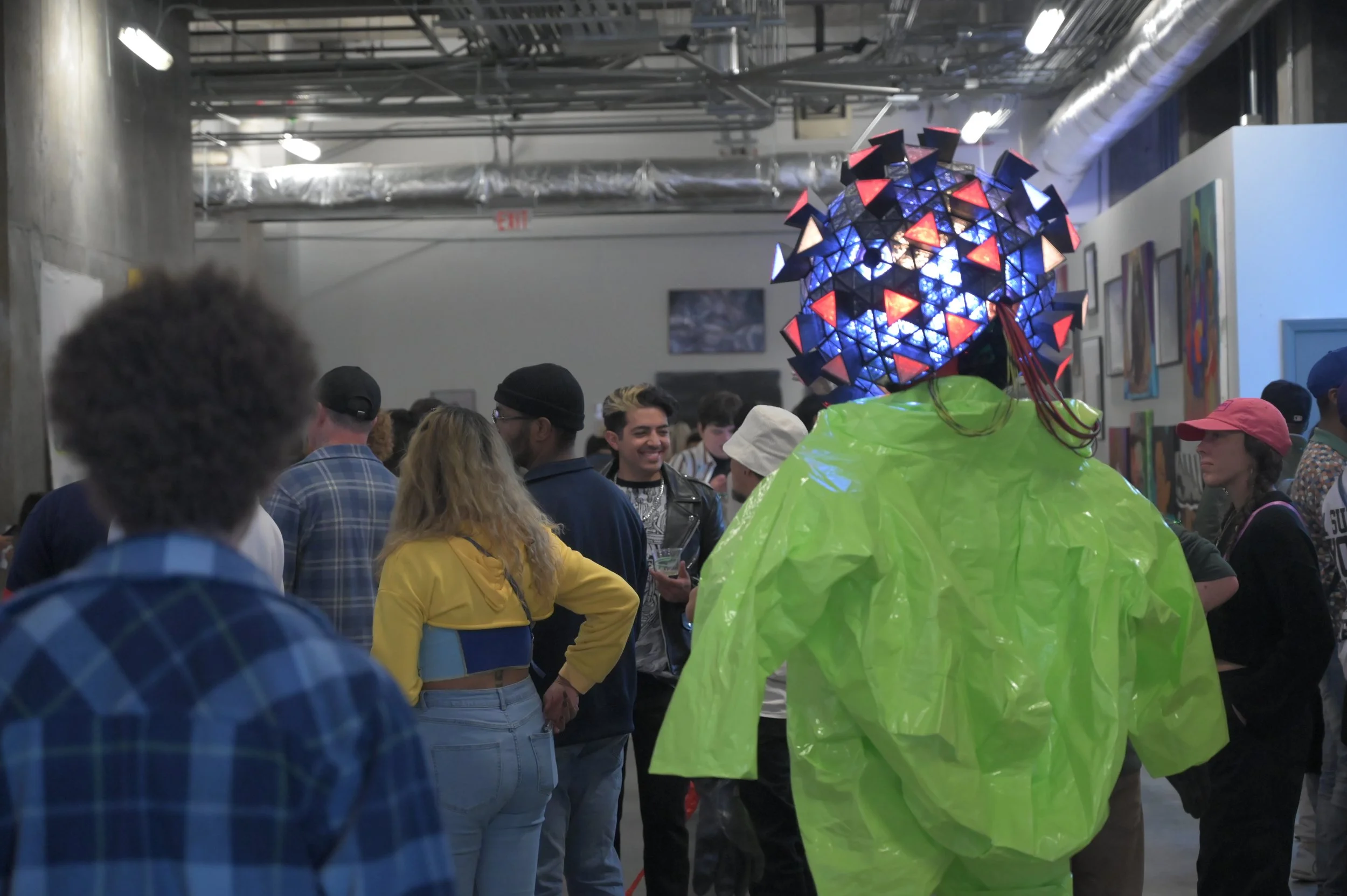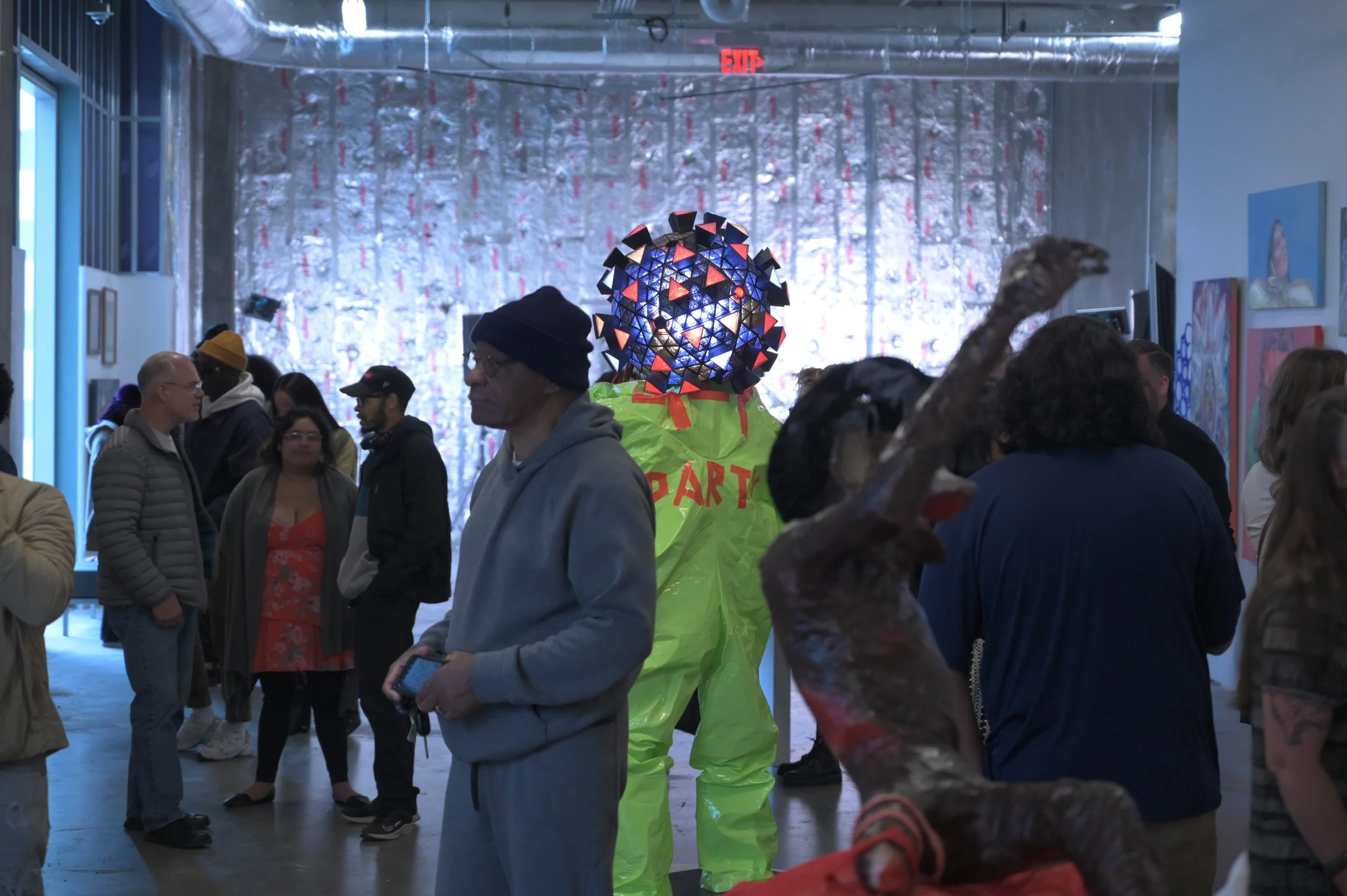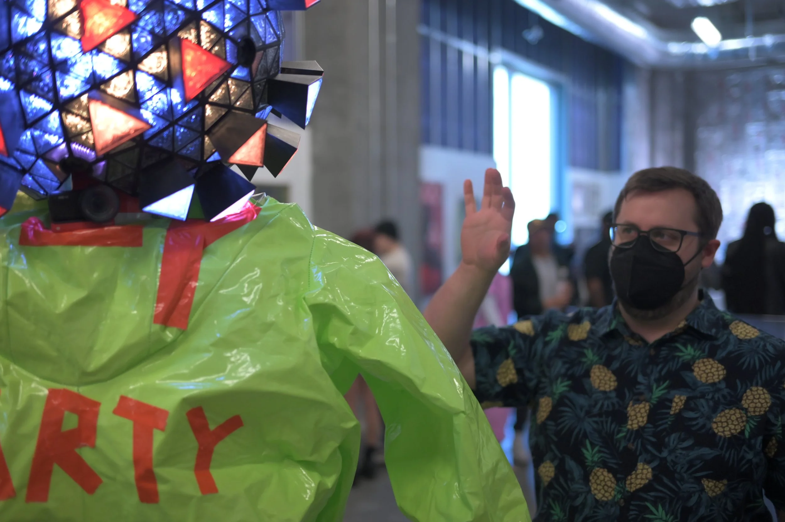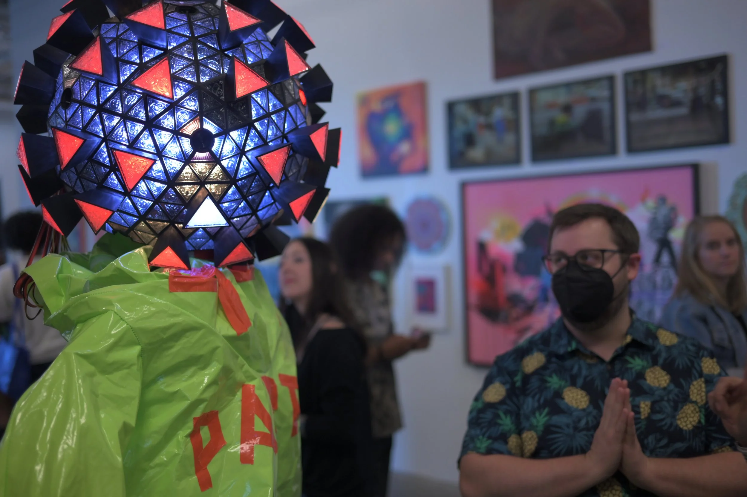 The Gift of Goodwill is a processing of the trauma of the COVID-19 pandemic and associated lockdowns. Inspired by the Waterford crystal covered Times Square New Years Eve Ball, this piece renders the ubiquitous red and white coronavirus with glowing crystalline lenses covered in emoji based iconography inspired by the symbols of lockdown. Designed as a wearable helmet, the piece is displayed with an actual hazmat suit adorned with “PARTY” - capturing the conflict between attempts to protect our communities and the selfishness exhibited by so many.